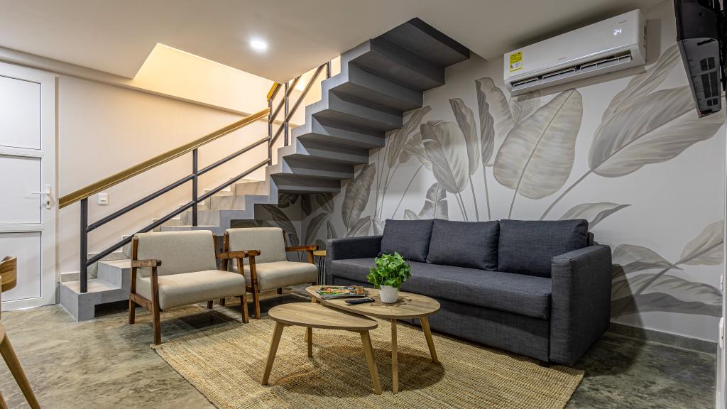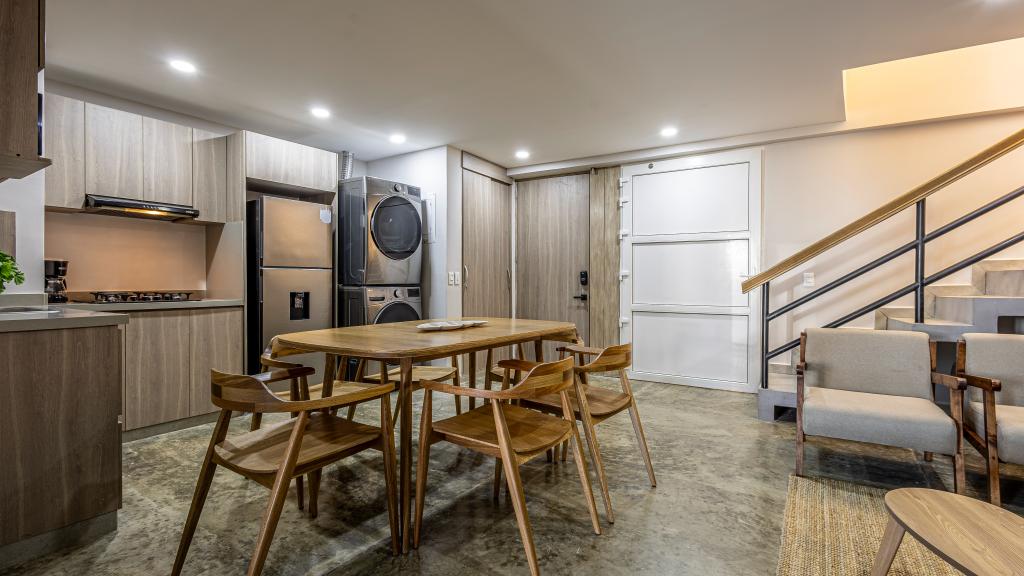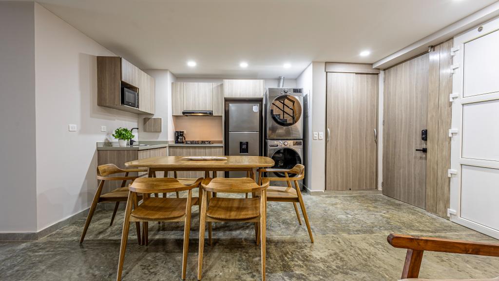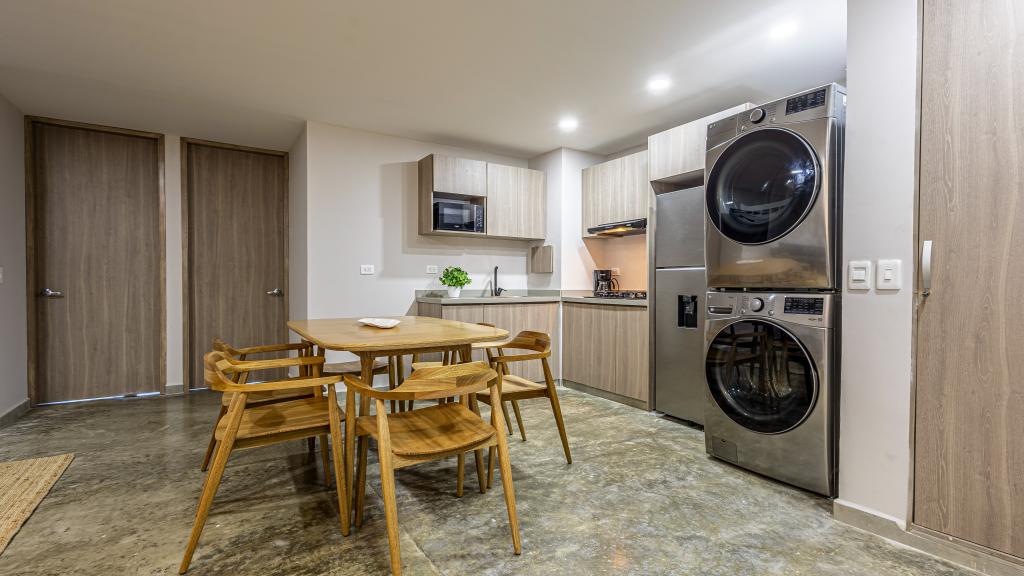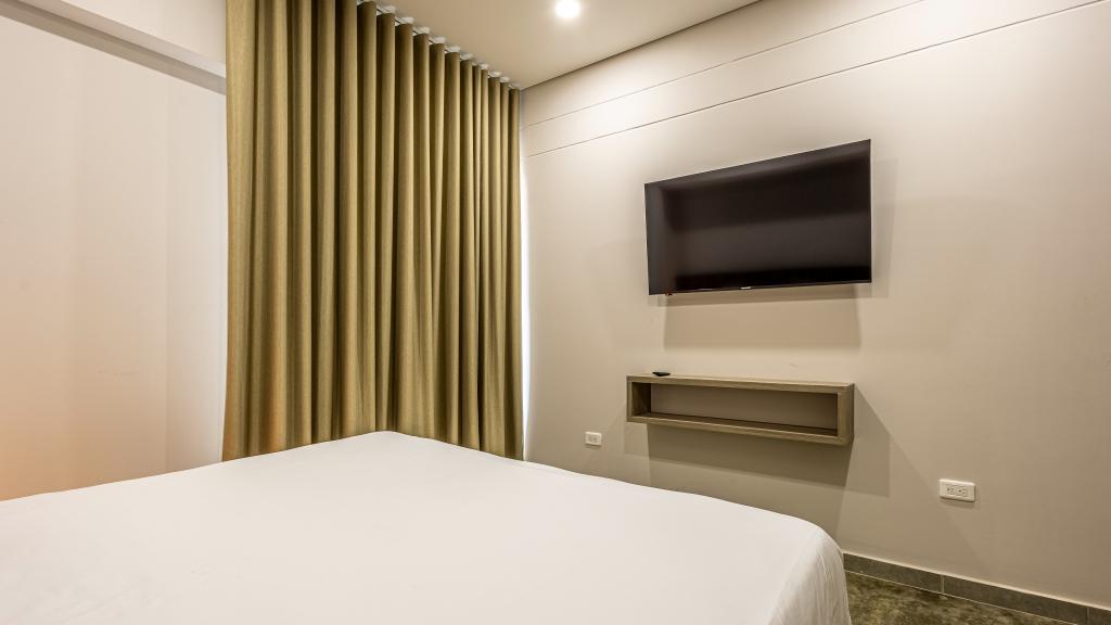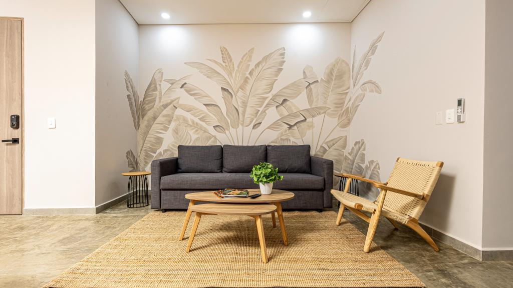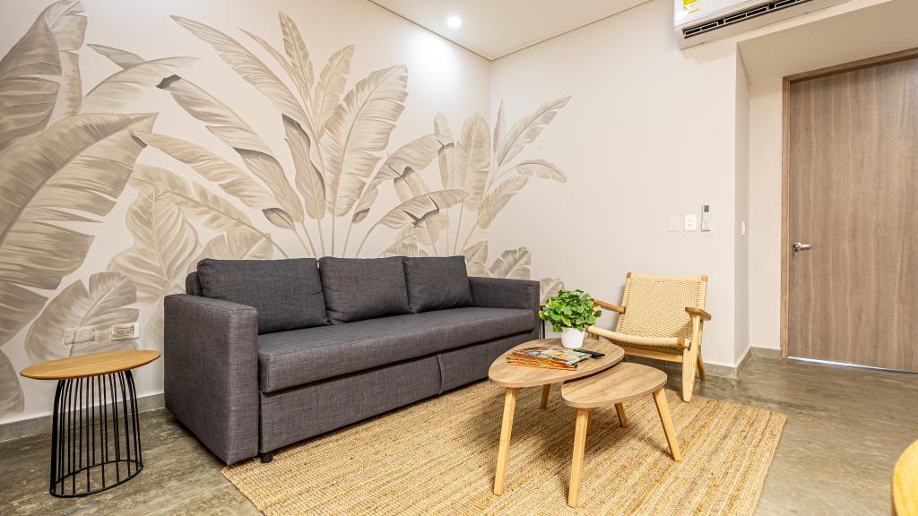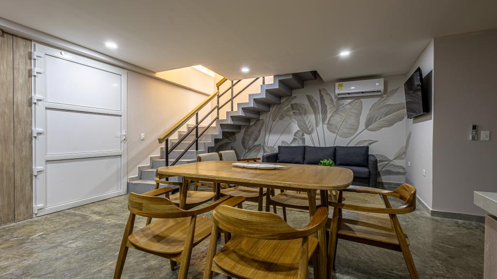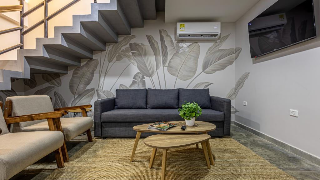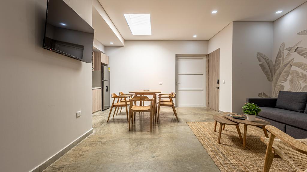 El apartamento es amplio, fresco y bien equipado. La cocina tiene todo lo que uno necesita y la sala con el Smart TV es perfecta para relajarse.